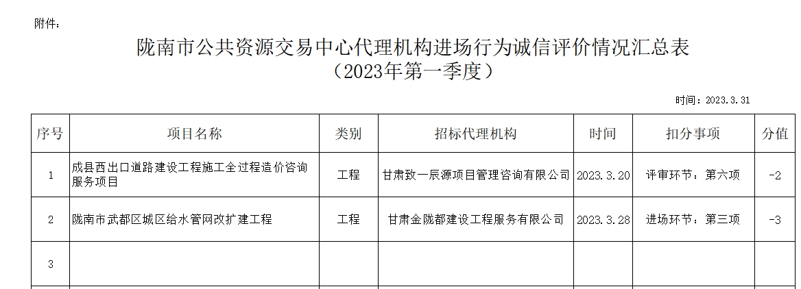 隴南市公共資源交易中心關(guān)于2023年第一季度代理機構(gòu)進(jìn)場行為誠信評價結(jié)果的公示