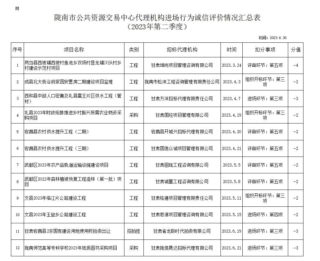 根據(jù)《甘肅省公共資源交易代理機(jī)構(gòu)管理辦法》(甘政辦發(fā)〔2019〕107號(hào))和《隴南市公共資源交易中心代理機(jī)構(gòu)進(jìn)場(chǎng)行為誠信評(píng)價(jià)實(shí)施制度(試行)》規(guī)定,現(xiàn)對(duì)2023年第二季度,共12家代理機(jī)構(gòu)12條進(jìn)場(chǎng)行為誠信評(píng)價(jià)記錄予以通報(bào)(詳見附表)。請(qǐng)各代理機(jī)構(gòu)嚴(yán)格遵守各項(xiàng)規(guī)章制度、誠實(shí)守信,規(guī)范操作,為招標(biāo)人和采購人提供專業(yè)、高效、規(guī)范的招標(biāo)代理服務(wù)。