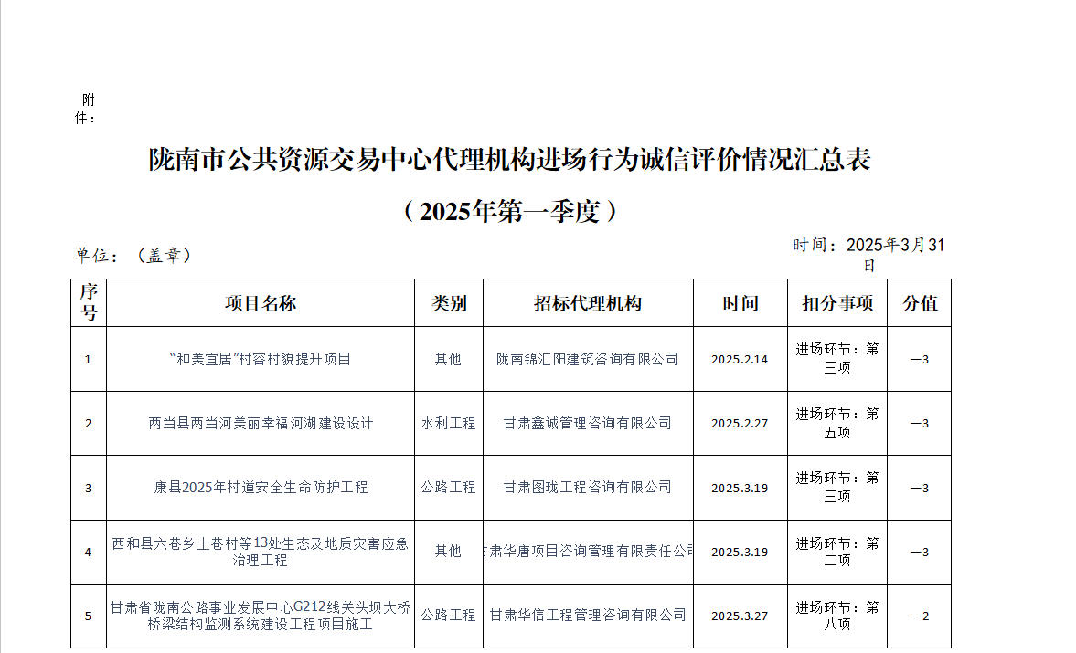 隴南市公共資源交易中心關(guān)于2025年第一季度代理機(jī)構(gòu)進(jìn)場行為誠信評價(jià)結(jié)果的公示