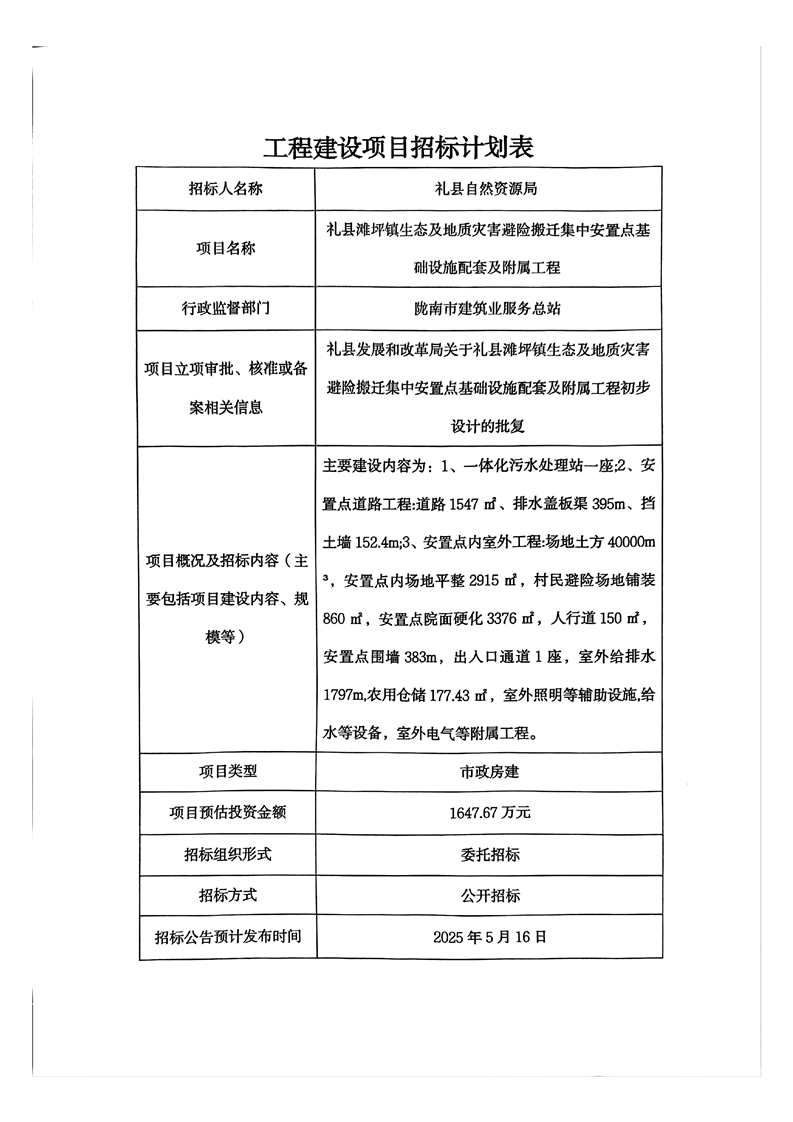 禮縣灘坪鎮(zhèn)生態(tài)及地質(zhì)災害避險搬遷集中安置點基礎設施配套及附屬工程