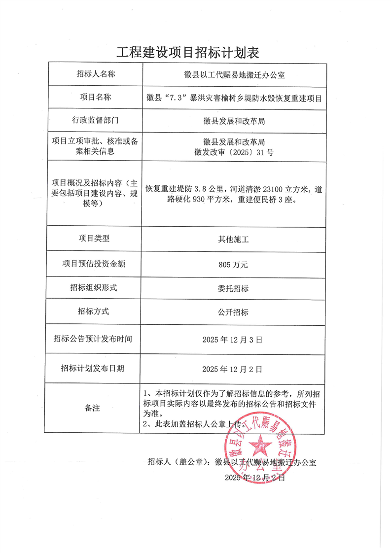 徽縣“7.3”暴洪災(zāi)害榆樹鄉(xiāng)堤防水毀恢復(fù)重建項目